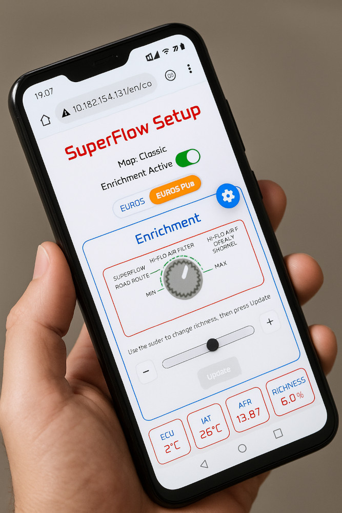 The original fuel supply is very poor, so SuperFlow makes the engine more lubricated and cooler, which ensures greater reliability and maximizes Power & Torque. SuperFlow allows you to regulate the enrichment to obtain the maximum possible torque gain and response at medium and low revolutions.